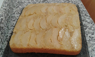 Ingredientes: 175g de mantequilla sin sal, 4 peras pequeñas peladas (2 botes de peras en su jugo), 1 cucharada de azúcar moreno, zumo de un limón, 175 g de azúcar blanco, 3 huevos grandes, 175g de harina con levadura incorporada (incorporaremos 2 cucharaditas- de las de café- de levadura en polvo - impulsor- por cada 100g de harina), 2 c.c. de canela, 1c.c. de mezcla de especias (jengibre, clavo, cardamomo, nuez moscada), 100 ml de nata agria (podemos prepararla añadiéndole a la nata un poco de zumo de limón y dejándola reposar unos 5 min.), 1 c.S. de miel.